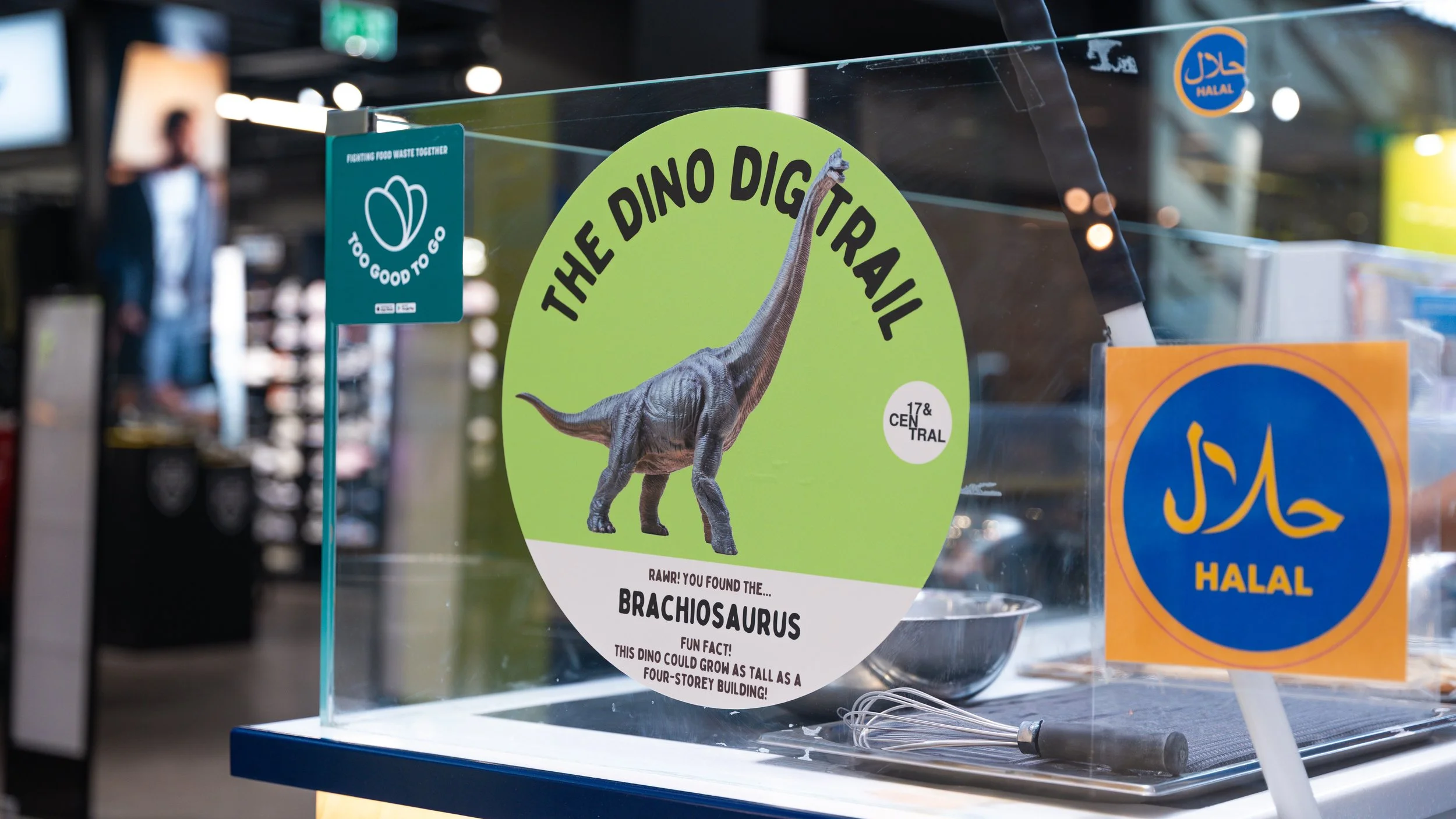 Interactive Trail: Large-format window vinyls displaying themed dinosaur graphics across the centre with trail markers on the map guiding families to each zone. The map included a completion card to encourage full-route circulation and return to base for a small reward.